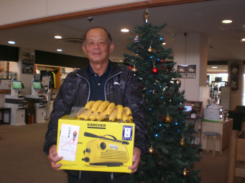 優勝賞品の ケルヒャー高圧洗浄機 を手に、満面の笑み。
